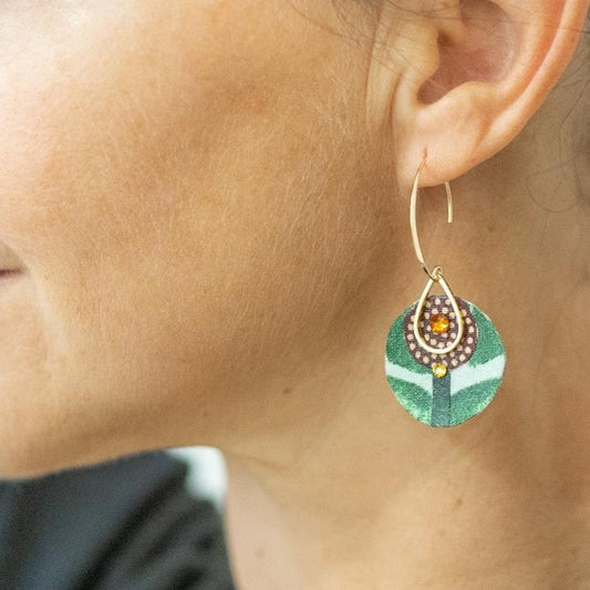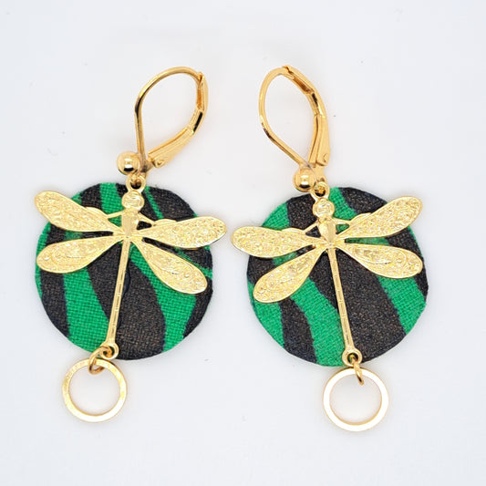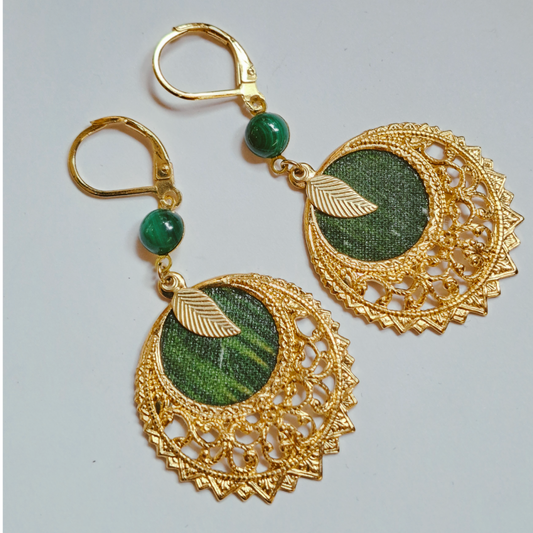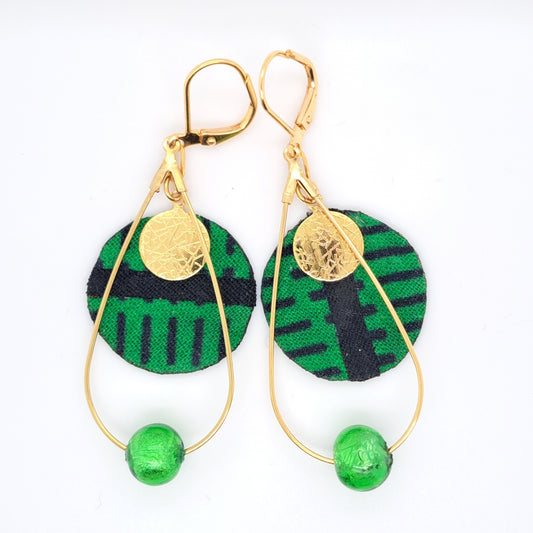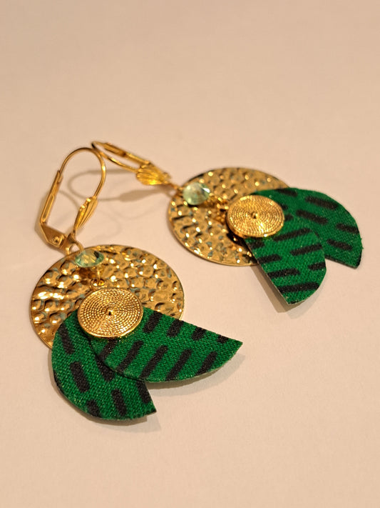 African Reverie - Gold-plated green round fabric earrings