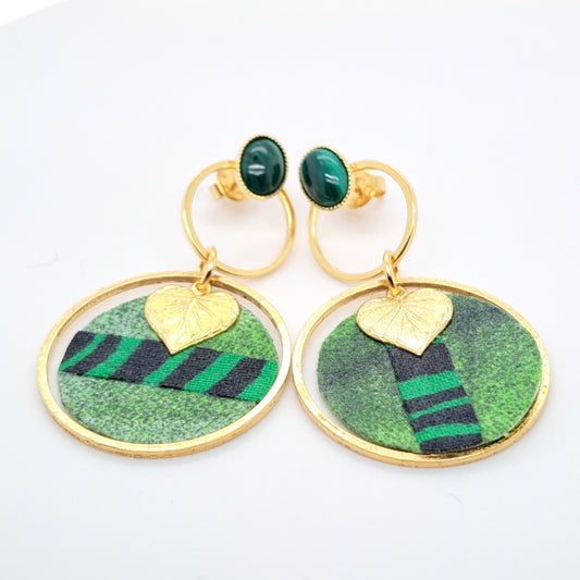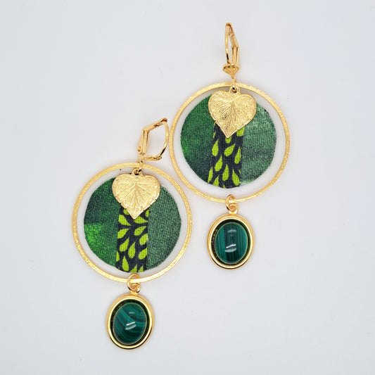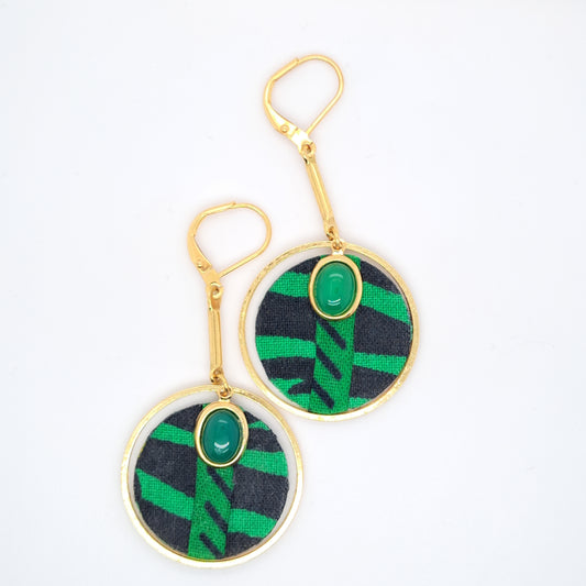 Palm Jungle - Gold green agate fabric earrings