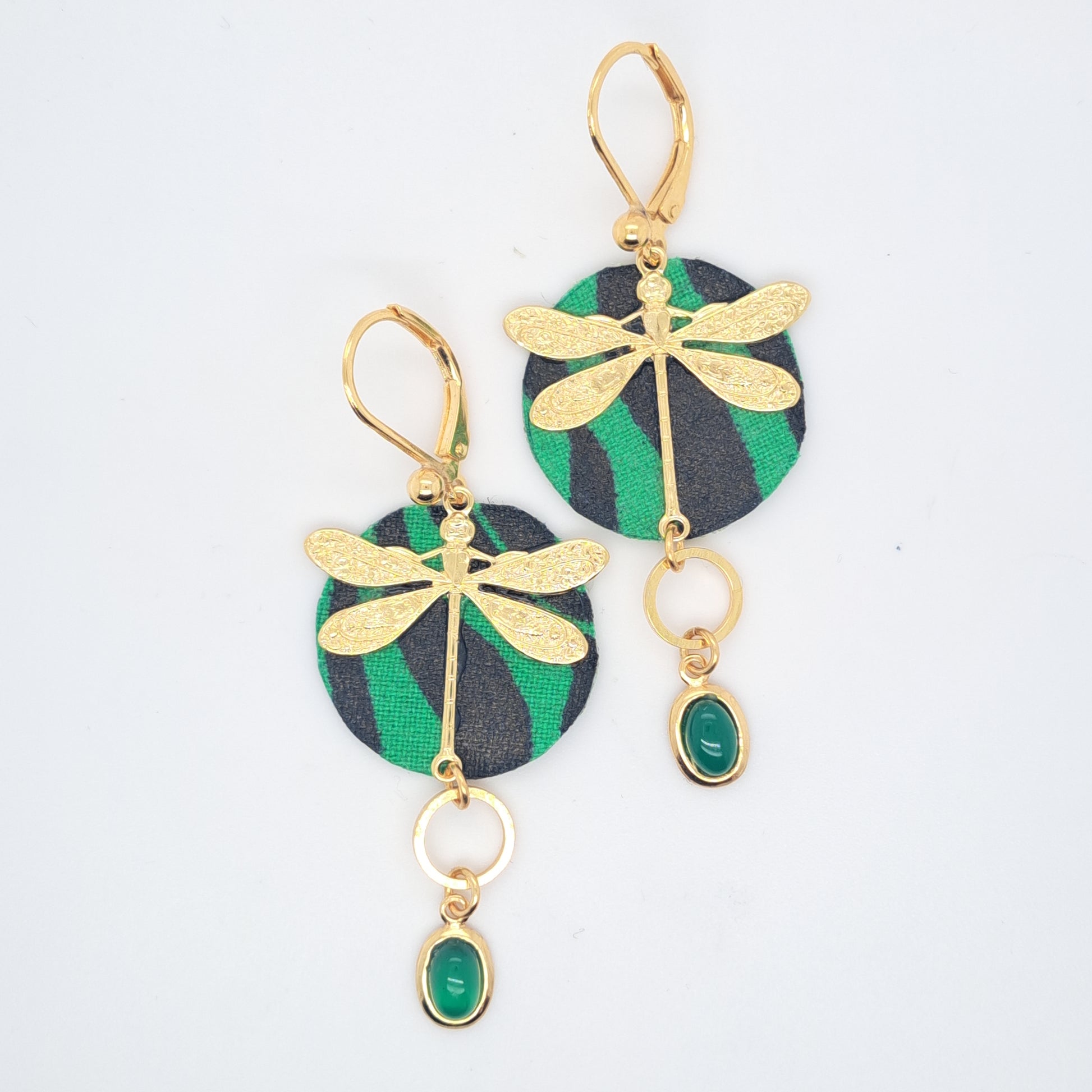 Plongez dans l'époque Art Nouveau et sa nouvelle esthétique avec la délicate paire de boucles d'oreilles Libre en libellule vert, une pièce unique avec des pierres en agate verte.